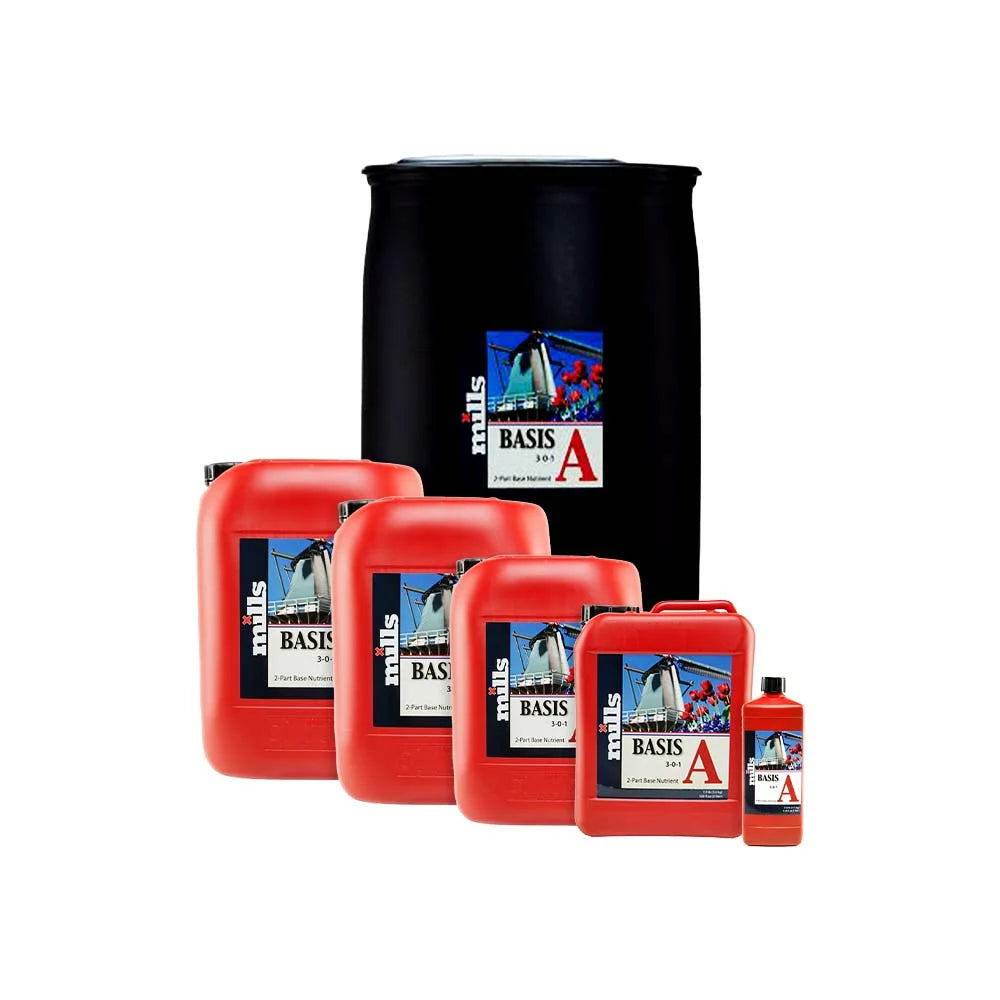 Basis A is one half of Mills two-part base nutrient feed. Basis A contains red iron and calcium together with other micro and macro nutrients that ensure optimal plant health and growth throughout the entire cycle. Use in equal parts with Mills Basis B.