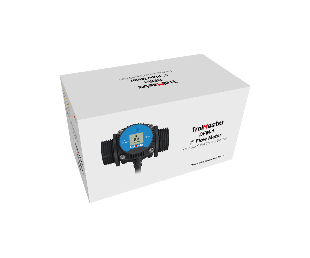TrolMaster's DFM-1 is a 1" digital inline flow meter that provides accurate measurements of water or a nutrient solution flowing through a fluid pipe. It is specially designed for the Aqua-X Pro system.